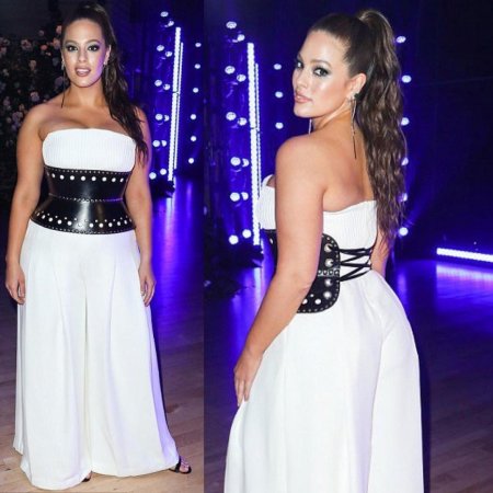 Для вечера топ-модель выбрала белоснежный комбинезон без бретелей и сделала акцент на своей талии, подчеркнув ее широким черным поясом. Однако Эшли является обладательницей весьма пышной груди, а комбинезон не был рассчитан на такие объемы в области лифа. И потому выдающийся бюст едва уместился в наряд, что не могло не привлечь внимание публики сети.