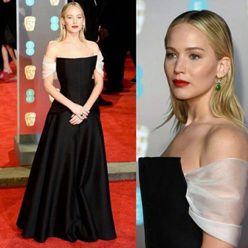Дженнифер Лоуренс всегда была достаточно пухленькой, но в Лондоне на красной дорожке премии BAFTA она появилась, заметно похудев. Ее талию подчеркнуло черное платье от модного дома Dior. Глянцевые СМИ назвали наряд актрисы одним из лучших в этот вечер, но вот общий образ Дженнифер не удовлетворил никого.