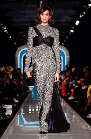 Второй выход модели был в длинном вечернем туалете, подчеркивающем достоинства изящной фигуры ее обладательницы. Гербер появилась на публике в сверкающем серебристыми пайетками платье, выгодно дополненном черной атласной лентой в районе груди, которая уходила вниз длинным шлейфом. Из аксессуаров девушка несла в руках длинный клатч с наименованием брэнда.Но далеко не все интернет-пользователи положительно оценили выходы подростка на подиум.