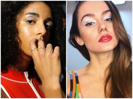 Макияж с показа Stella Jean весна 2018 (слева) и макияж блогера @erykasokolska (справа)В трактовке серебристого, буквально «текучего» (за счет кремовой текстуры и эффекта металлик) макияжа блогеры показывают более жизненные варианты. Если на показах были и слезинки, и слишком яркие тени, и блестки, разбросанные в хаотичном порядке, то у моделей из Instagram все четко. Аккуратная подводка нижнего века, монотени одного оттенка или небольшой акцент в уголке — в общем на все случаи жизни и без риска оказаться слишком фривольной.