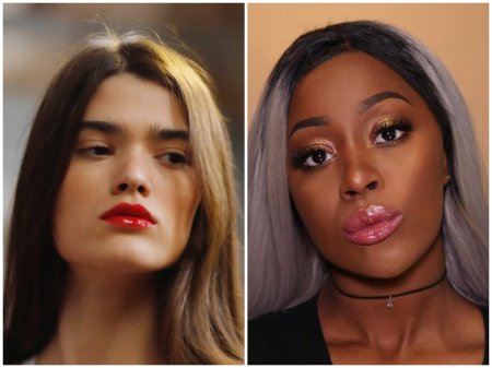 Макияж с показа Philosophy весна 2018 (слева) и макияж блогера @graceonyourdash (справа)Любовь к матовым текстурам по-прежнему сильна, но и глянец не сдает позиции. Для закрепления в бьюти-чартах он выбрал двойную атаку: на яркую розовую или красную помаду наносят блеск, который затмит любой хайлайтер.