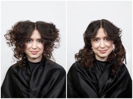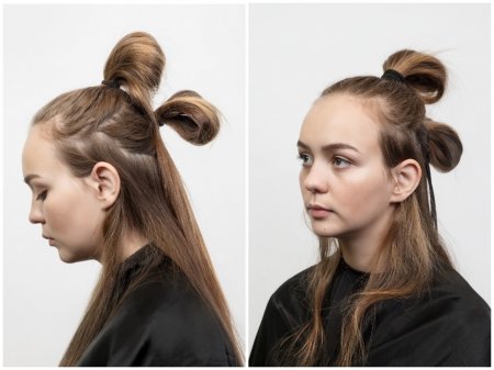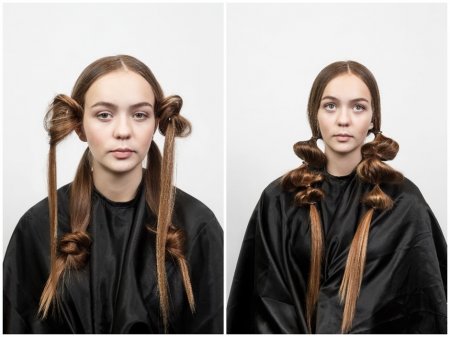 Раздели волосы на равные половины, пробор по центру. Сделай два хвоста, на каждом — завяжи по три резинки (на расстоянии 5—7 см, хотя все еще зависит от твоей длины волос, разумеется). Подтяни волосы чуть наверх правой рукой, левой при этом придерживая кончик прядей, — именно так и сформируются шарообразные текстуры. Кончики волос вновь должны остаться максимально прямыми (опять же для контраста).