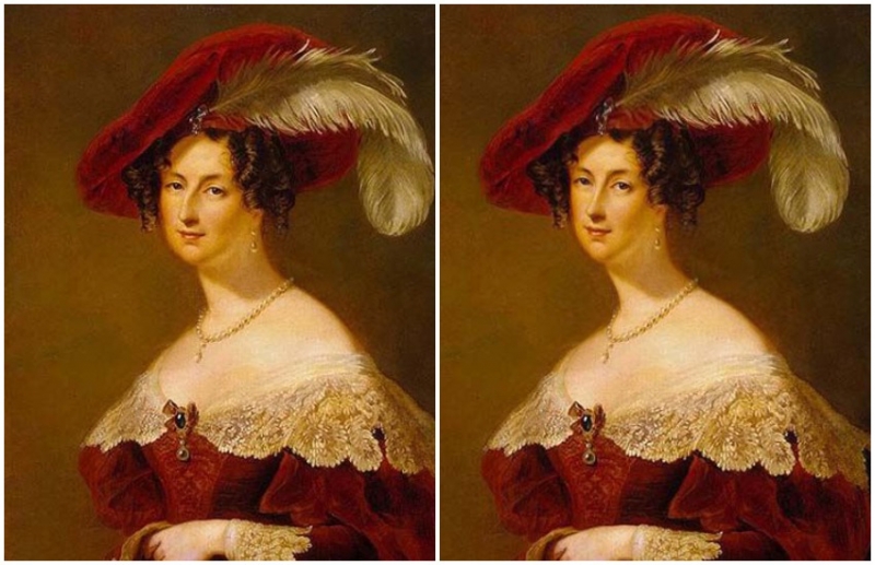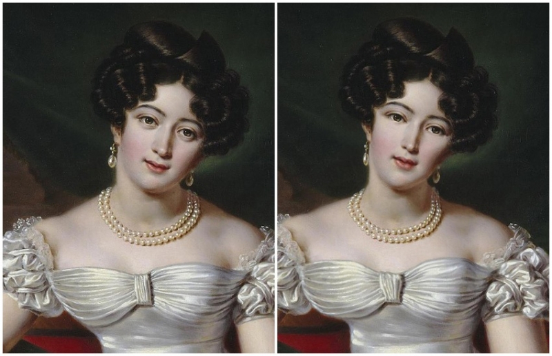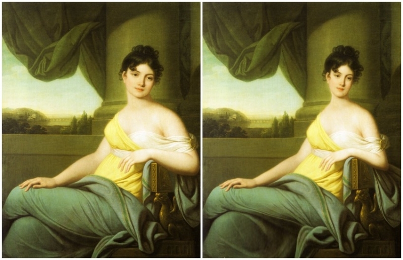 Графиня Елизавета Воронцова очаровала самого Пушкина. Некоторые говорят, что их роман был исключительно платоническим, другие — что она родила от него дочь Софью. На портрете у Елизаветы Воронцовой идеально гладкая кожа, но чуть полное лицо. А еще заметна горбинка на носу. Далеко не все женщины готовы ее гордо носить. Так что она — возможный кандидат на ринопластику.