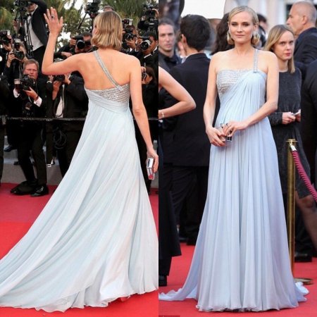Знаменитость появилась на ковровой дорожке перед сотнями репортеров в светло-голубом платье, лиф которого украшало множество сверкающих камней, присутствующих также на тонкой бретельке, закрепляющей наряд на одном плече. Легкая ткань вечернего туалета Дианы развивалась вокруг ее стройной фигуры и напоминала зрителям о древней Греции и прекрасной Елене, которую однажды сыграла актриса.
