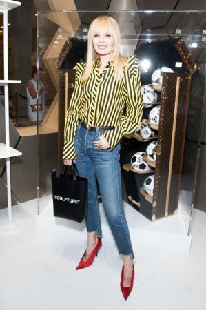Артистка появилась на открытии выставки в черно-желтой полосатой блузке, визуально увеличивающей ее хрупкие плечи благодаря дизайнерской хитрости, канувшей в лету еще в середине 90-х годов и известной в народе, как поролоновые плечики. Яркий верх Валерия уравновесила довольно скромным низом, надев укороченные брюки из плотного синего денима с завышенной талией. Красные закрытые туфли-лодочки на высоком каблуке удачно завершили образ знаменитости.