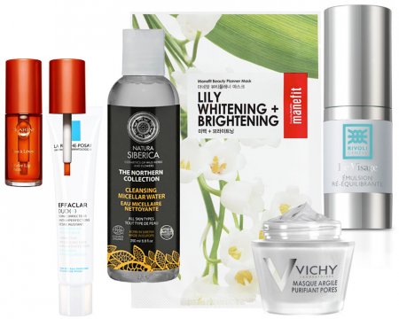 Мицеллярная вода с древесным углем, Natura SibericaМинеральная очищающая поры маска с глиной, VichyУвлажняющий пигмент для губ, Clarins Корректирующий крем-гель для проблемной кожи, La Roche-PosayВосстанавливающая эмульсия, RivoliУвлажняющая тканевая маска с лилией, Manefit