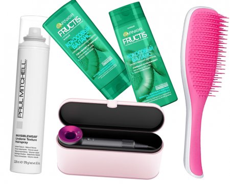 Лак для объема Undone Texture Hairspray, Paul Mitchell; укрепляющие шампунь и бальзам, Fructis; лимитированный фен Dyson Supersonic; расческа для влажных волос The Wet Detangler, Tangle TeezerИспользуем не ту расческу