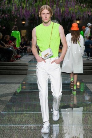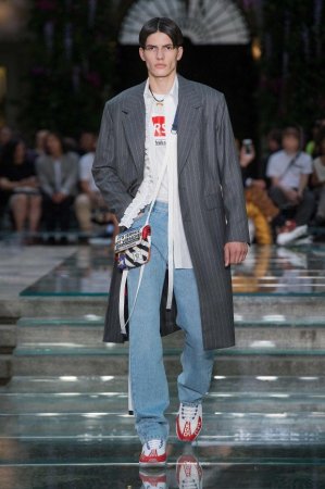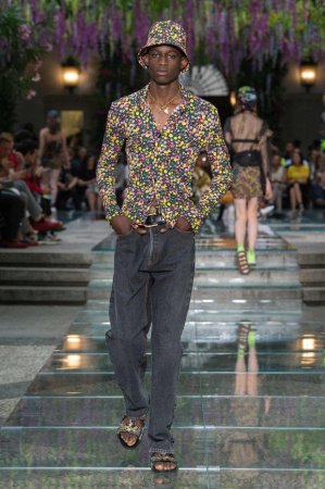 Этот мужчина легко и с иронией смешивает шнуровку и тонкую почти прозрачную ткань, неон и цветочные принты. Традиционные строгие пиджаки комбинируются с брюками в стиле багги из денима. Принт Tabloid служит напоминанием о мире звезд, в котором мы живем.