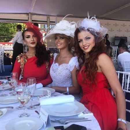 Группа QUEENS, по всей видимости, заранее договорилась о нарядах и пришла на скачки в красно-белых платьях и изысканных шляпках.