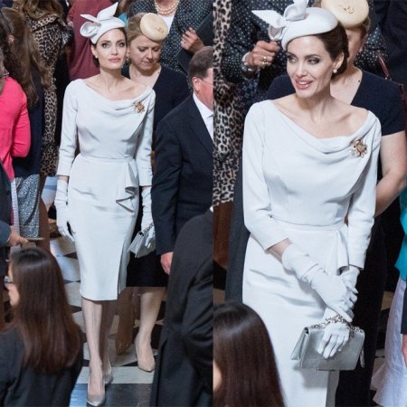 Бывшая возлюбленная Брэда Питта отлично выглядела в строгом светлом платье и перчатках, ее голову украшала вычурная шляпка замысловатой формы. Джоли украсила уши серьгами с камнями и не забыла прикрепить к платью орден, который ей вручила королева Великобритании Елизавета II за активную благотворительную деятельность.