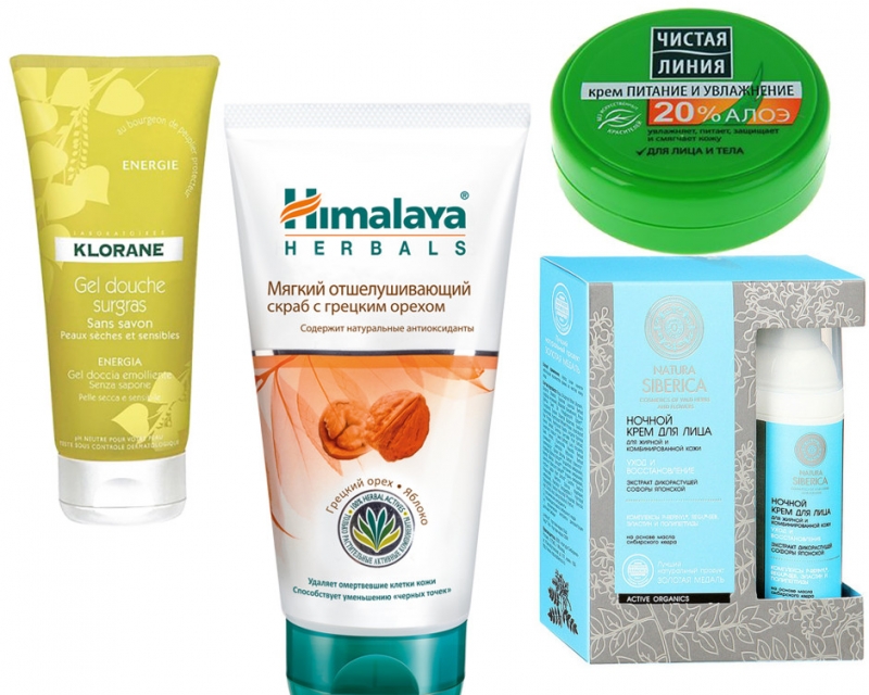 Питающий и увлажняющий крем, Чистая линия Ночной крем для лица ля жирной кожи, Natura SibericaКупить Мягкий отшелушивающий скраб с грецким орехом, HimalayaКупить Увлажняющий гель для душа, KloraneКупить