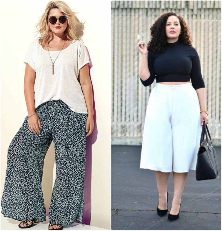 Полненьким девушкам отлично подойдут широкие брюки. Модные, нынче, кюлоты не исключение.