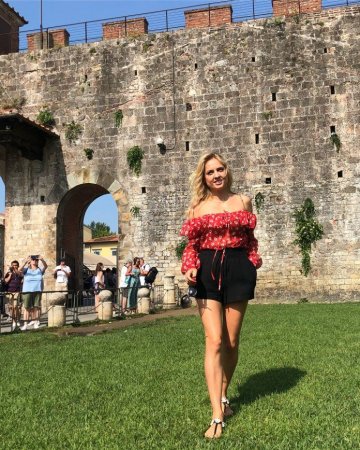 Отечественная актриса Янина Студилина не так давно стала мамой, однако проводить свой декрет в четырех стенах звезда не намерена, и со своей полуторагодовалой дочерью Янина отправилась в Италию, где с удовольствием проводит летние каникулы и погружается в культуру страны. А какой отпуск в Европе без шопинга? И как любая модница, Студилина прошлась по магазинам, где помимо всего прочего ей на глаза попалась очаровательная красная блузка в белую ромашку, и приятную обновку актриса тут же надела для фотосессии в городе Пиза у знаменитой Падающей башни.