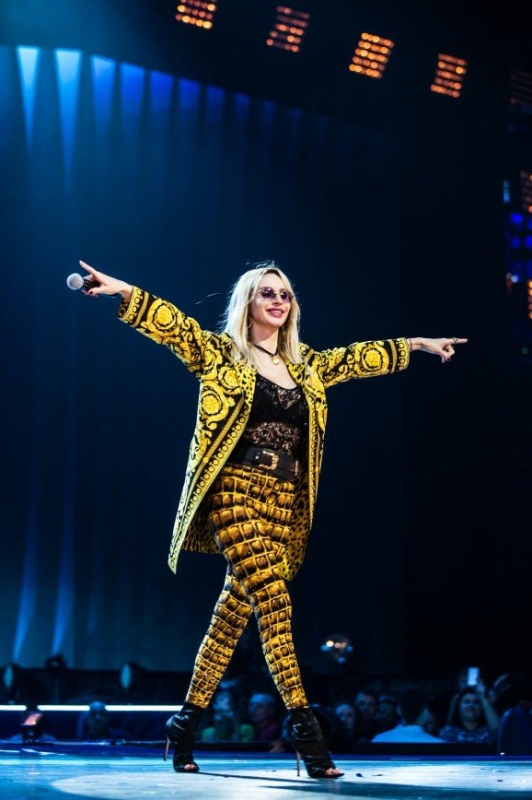 Артистка вышла на сцену в довольно скромном образе, состоящем из обтягивающих брюк со змеиным принтом черно-желтого цвета и удлиненного свободного жакета, выполненного в той же цветовой гамме. Завершили образ блондинки ажурный черный топ с глубокой линией декольте и полуботинки на высоком каблуке. Но как известно, интернет-критики порой бывают излишне внимательны к мелочам и деталям. Так, например, из всего облика Лободы больше всего нареканий вызвали именно брюки, которые по мнению некоторых модников выглядели «нелепо» на слегка пополневшей после родов Светлане.