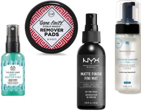 Матирующий спрей для лица Mint Mattifying, The Body ShopСалфетки для снятия макияжа Gone-finity, J.CatФиксатор макияжа Matte Finish, NYXУспокаивающая очищающая пенка для чувствительной и склонной к акне кожи, SkinCeuticals