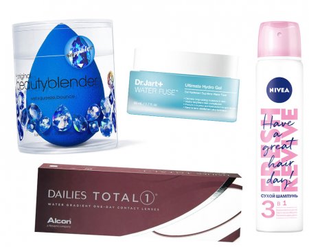 Сухой шампунь 3 в 1, NiveaУвлажняющий гель для кожи вокруг глаз Water Fuse, Dr.Jart+Бьютиблендер SapphireОднодневные линзы, Alcon