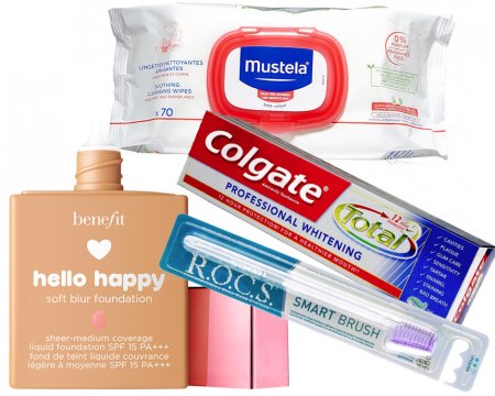 Очищающие успокаивающие салфетки, MustelaПаста, Total 12 ColgateЗубная щетка Smart Brush, R.O.C.S.Тональное средство Hello Happy, Benefit