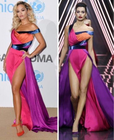 Рита появилась перед публикой в разноцветном наряде от Ralph&Russo с глубоким декольте и высоким разрезом до бедра. Идеально подобранные в цвет платья туфли на невысоком каблуке стали приятным дополнением сказочного облика певицы. Яркий образ звездной красавицы невероятно гармонично вписался в общую атмосферу летнего вечера.