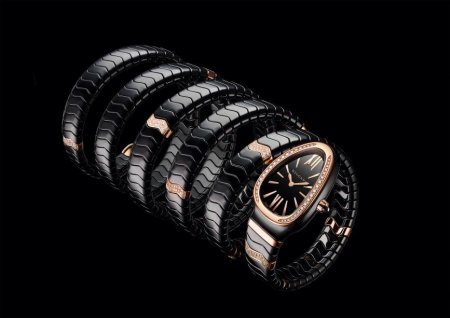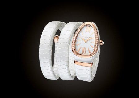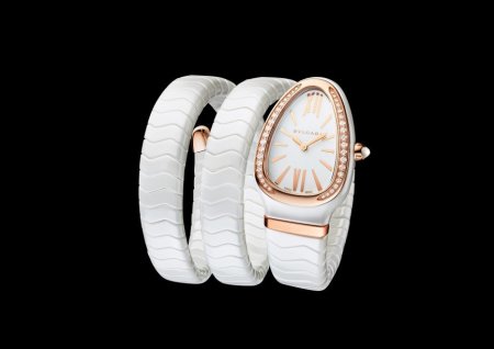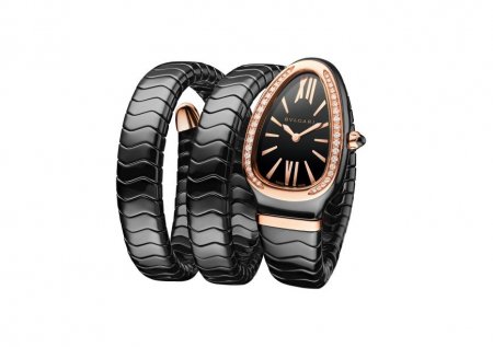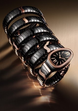 Часы Serpenti Spiga, выполненные в керамике белого или чёрного цвета с деталями из розового золота, облегают запястье в два оборота столь же нежно, как и их родственники с цельнозолотыми браслетами или кожаными ремешками. Корпус из розового золота, обрамляющий чёрный или белый лакированный циферблат, представляется совершенно естественным продолжением браслета, тем самым утверждается решительно современный характер новых моделей. Тем временем одна из моделей Spiga делает смелый подход к беспрецедентным высотам, дерзко накручивая вокруг предплечья пять оборотов черного керамического браслета с декорированными бриллиантами деталями из 18-каратного розового золота!