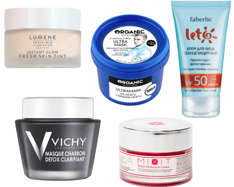 Солнцезащитный крем для лица, FaberlicДеток-маска с древесным углем, VichyВосстанавливающий крем, защищающий от неблагоприятных внешних факторов, MIXITОчищающая отшелушивающая маска для лица, Organic KitchenУхаживающий крем с тональным эффектом, Lumene