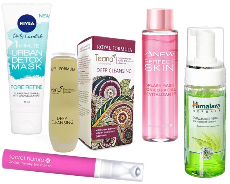 Детокс-маска с зеленым чаем, NiveaМаска для лица Anew, Avon Очищающая пенка, HimalayaРазглаживающая роллер-сыворотка, Secret Nature Гидрофильное масло, Teana