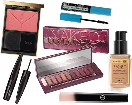 Блеск для губ, оттенок Acqua, Giorgio ArmaniВодостойкая тушь, EssenceПалетка из 12 оттенков теней, Urban DecayРумяна, Yves Saint LaurentПодводка, Wine Potion, Dark Wonder (Л'Этуаль)Тональное средство, Max Factor