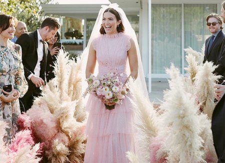 Американская актриса и певица Мэнди Мур тоже выбрала для свадьбы розовый. Этим летом она стала женой рок-музыканта Тейлора Голдсмита. Для церемонии в стиле бохо, которая прошла в Лос-Анджелесе, идеально подошли полупрозрачное платье с воланами американского бренда Rodarte и бархатные балетки. Правда, образ из весенней коллекции был немного «отредактирован» — с нежно-розовой ткани «убрали» черный горох.
