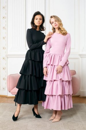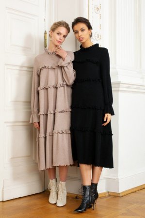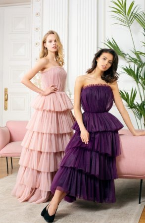 Главным акцентом коллекции стали воздушные многослойные платья-пирожные из тюля ( cake dress), представленные в трех ярких цветах - голубой, розовый и зеленое яблоко и длине миди и макси. Несмотря на то, что визуально образы сложны, они идеально вписываются в гардероб и прекрасно садятся практически на любую фигуру.