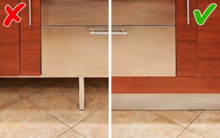 Он выполняет несколько важных функций: закрывает пространство под тумбами от пыли и мелкого мусора, к тому же с его помощью кухня выглядит намного более опрятной. Его стандартная высота — 10–15 см.