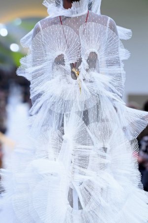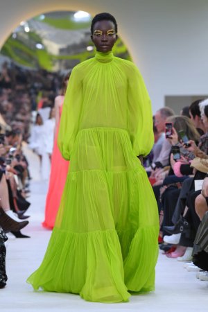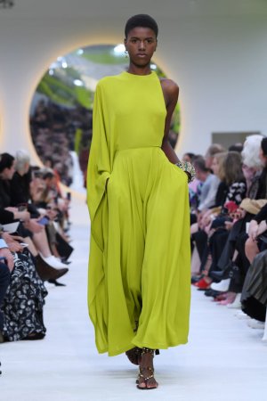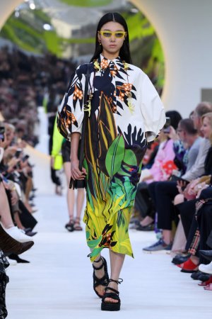 К слову, белоснежным образам, которых было не меньше десятка, ничуть не уступали интерпретации в ярких тонах: на подиуме появились летящие платья всевозможных флуоресцентных оттенков, блузы с принтом в виде обезьян и лиан, а также необычные и изящные украшения из «ломанного» золота.