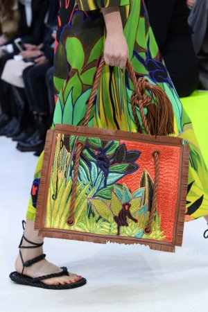 Перья, плетеные сандалии, сумки с яркой вышивкой, крупные серьги из золота, амулеты, глиттер на глазах моделей, солнцезащитные очки в неоновой полупрозрачной оправе.