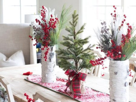 Можно собрать зимний букет, используя кашпо, вазу либо другую емкость. Смешать хвойные растения с украшениями в различных цветах, сосновыми шишками, эвкалиптом. Также прекрасным дополнением к праздничному букету станут красные зимние ягоды в виде калины или шиповника.