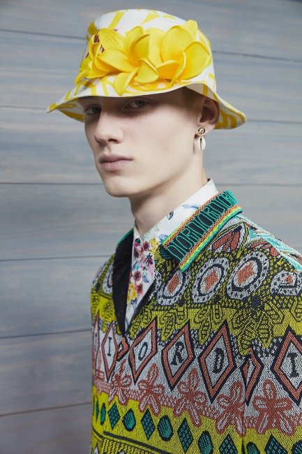 Вышивка, материалы, технология пошива — дань высокой моде и наследию дома — соединены с психоделическими элементами, чтобы создать эстетику, использующую различные влияния. Французские береты и панамки в стиле тех, что носили моряки, созданные Стивеном Джонсом, дизайнером головных уборов Dior, украшены яркими цветами. Цветочные мотивы, змеиные принты, клетка и полосы дополняют коллекцию, создают неожиданную гармонию и сочетаются с фирменным диагональным орнаментом oblique motif.