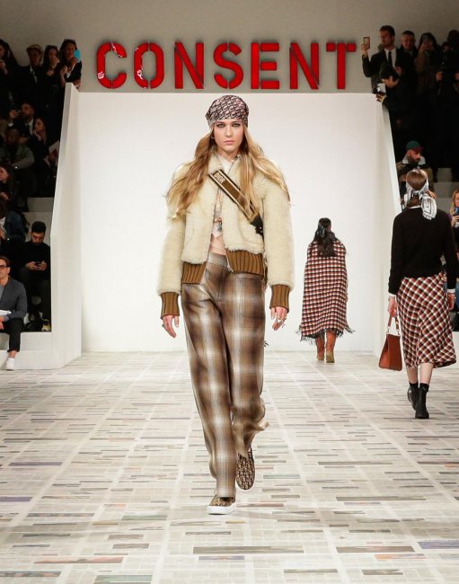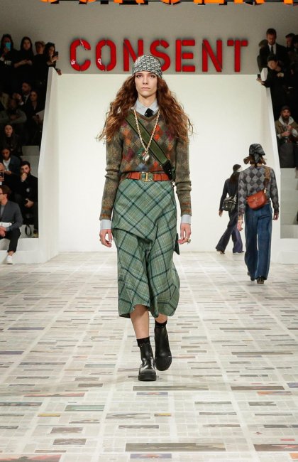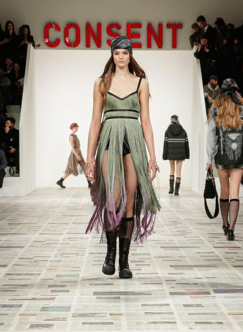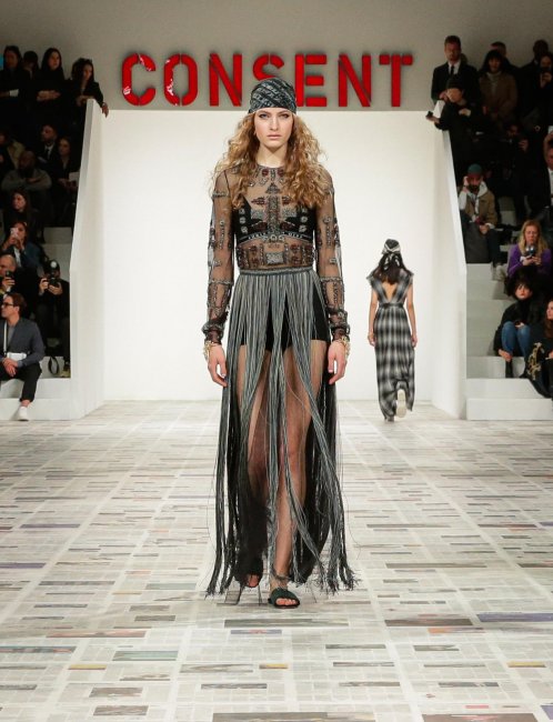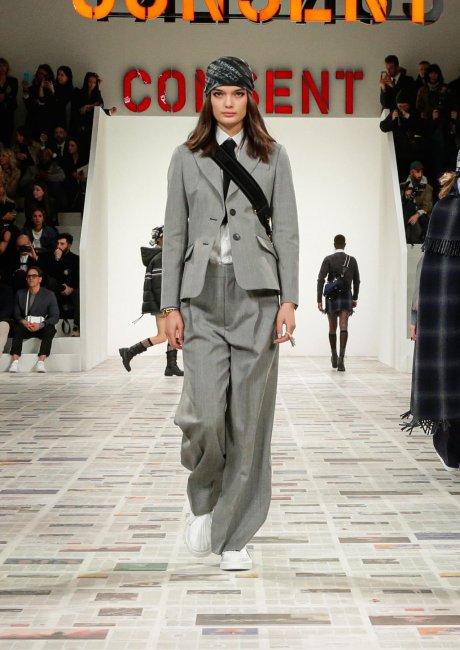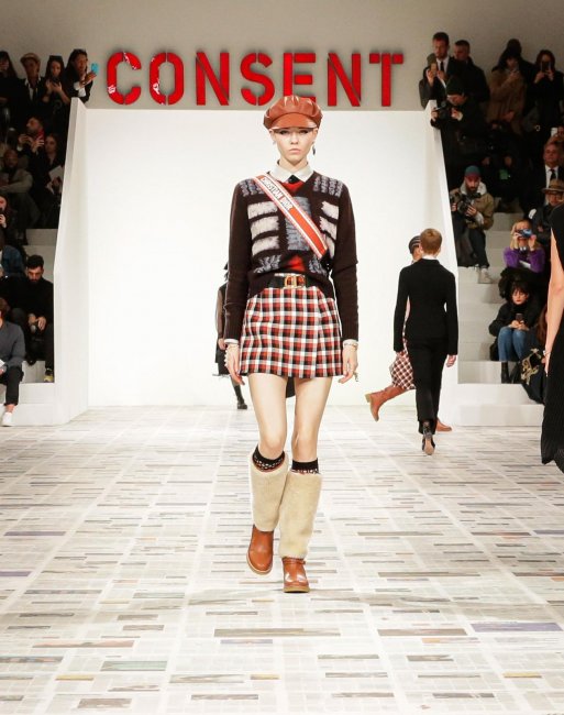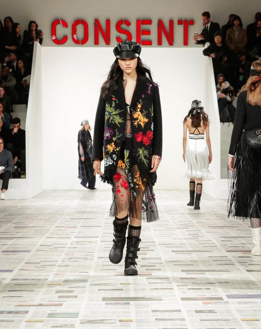 Стоить уделить отдельное внимание сценографии показа, которую создало объединение французских художников, носящее имя Claire Fontaine.Клэр Фонтейн является автором неоновых вывесок-манифестов — по задумке автора, они являются своего рода субтитрами, рассказывающими как реальность может (и должна) восприниматься, если бы оно было бы продиктовано мужской точкой зрения.Пол павильона, в котором прошел показ, она также украсила своей работой Newspaper, состоящей из копий страниц французской ежедневной газеты Le Monde.