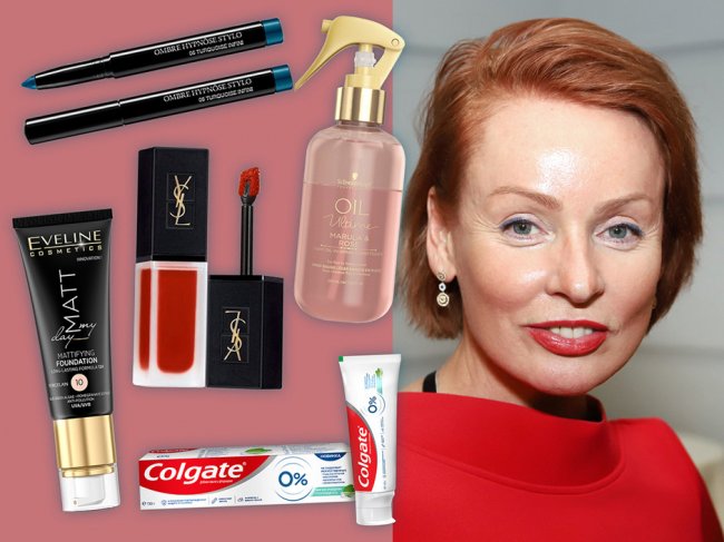 Зубная паста, ColgateМатовый тональный крем, Eveline Помада, Yves Saint Laurent Синий карандаш для глаз, Lancome Кондиционер, Schwarzkopf