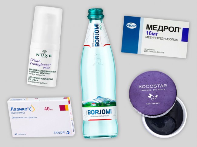 Минеральная вода, БоржомиПатчи для глаз, KocostarМетро от отеков, PfizerКрем для зоны вокруг глаз, NuxeЛазикс против отечного синдрома, Sanofi