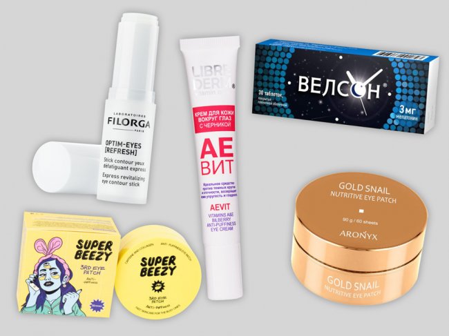 Патчи для глаз, AronyxПрепарат с мелатонином, ВелсонПатчи для глаз, Super BeezyКрем для кожи вокруг глаз, Filorga Крем для кожи вокруг глаз, Librederm