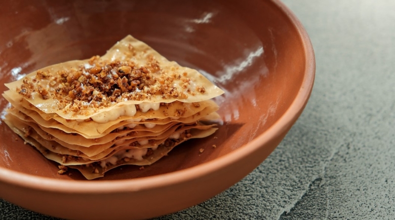 Традиционные восточные вкусы – в современной форме. Классические сочетания – сложнее и тоньше. Folk в своей манере переделывает знакомые истории на новый лад, и даже сладкая пахлава превращается в невесомый мильфей с прозрачными слоями из фило-теста и воздушным кремом из гречишного меда, пекана и белого шоколада. В знаменитой печи теперь пекут тарт с инжиром – на тонком до хруста слоеном тесте, прослаивая спелые фиги кремом из кардамона, фисташек и каштанового меда.