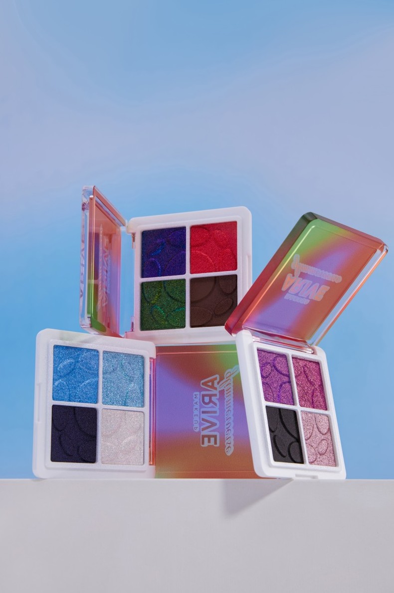 В палетках четыре оттенка в разных текстурах: сатиновой, матовой и двух мультихромах, обеспечивающих космическое сияние. За счёт пигментов, которые переливаются не двумя, а тремя цветами, мультихромные тени придают макияжу эффект многомерности.