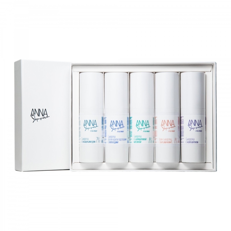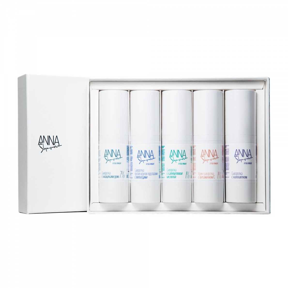 В наборе: сыворотка с коллагеном и гиалуроновой кислотой, сыворотка с пептидами для области вокруг глаз, сыворотка с ниацинамидом 7%, сыворотка с инкапсулированной салициловой кислотой 1%, крем-сыворотка с аскорбил тетраизопальмитатом 1%.