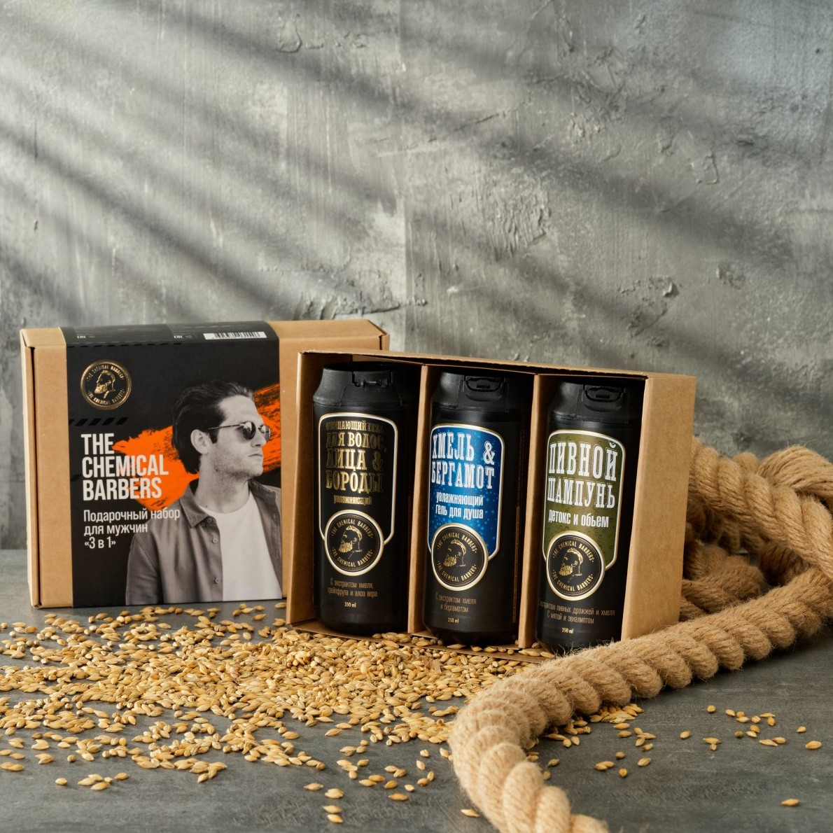 Например, подарочный набор «3 в 1» состоит из трех средств на основе пивной формулы и разработан для комплексного ухода за кожей и волосами. Пивной шампунь избавляет от избыточной жирности кожи головы, восстанавливает структуру волоса, делая их гуще и плотнее. Увлажняющий гель для душа «Хмель и бергамот» очищает кожу и помогает надолго сохранить ощущение свежести. Очищающий гель для волос, лица и бороды увлажняет кожу лица, смягчает щетину и бороду, придает волосам блеск и густоту, упрощает процесс укладки.