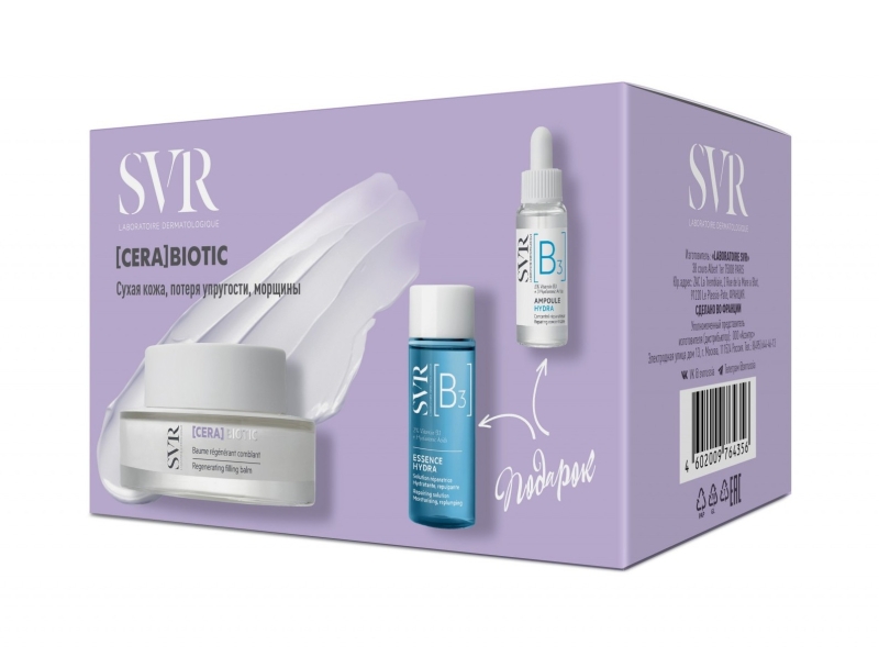В наборе [CERA] BIOTIC сыворотка для повышения упругости кожи и увлажняющий лосьон дополнены восстанавливающим бальзамом для коррекции морщин и повышения эластичности кожи. Три активных компонента в его составе — пробиотики, гиалуроновая кислота и витамин С — стимулируют регенерацию кожи.