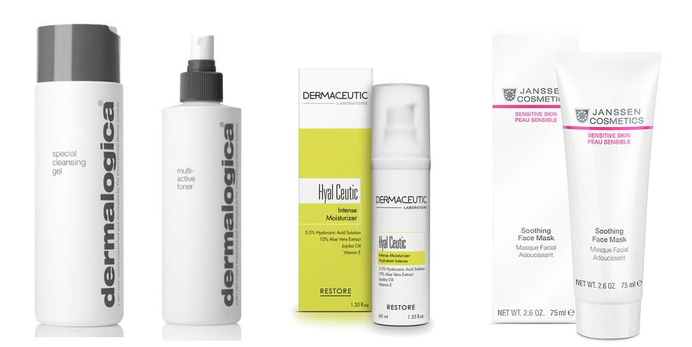 Очищающий гель для умывания Special Cleansing Gel, 3 010 руб., Dermalogica; увлажняющий спрей Multi-Active Toner, 2 880 руб., Dermalogica; интенсивный увлажняющий крем для нормальной и сухой кожи Hyal Ceutic, 4 070 руб., Dermaceutic; успокаивающая смягчающая маска «Скорая помощь» Soothing Face Mask, 2 583 руб., Janssen