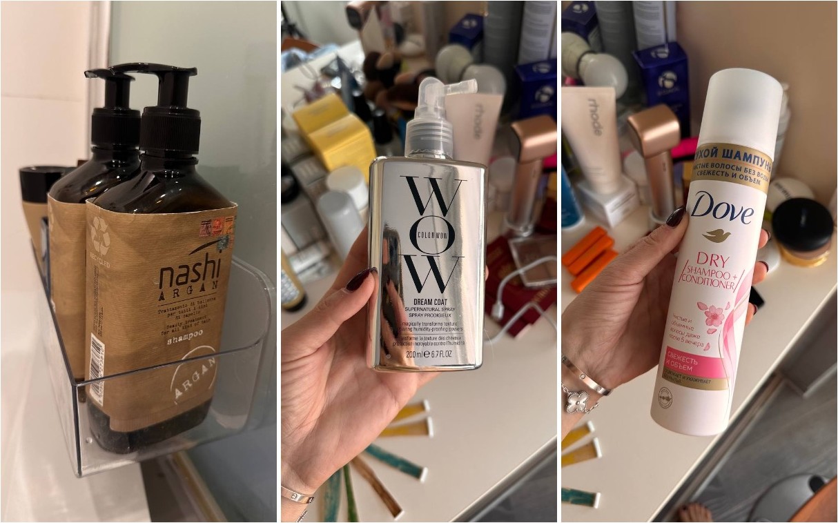 Далее уход за волосами. У меня вся линейка от Nashi Argan. Знаю, что и мои подруги им пользуются – очень классный итальянский бренд, продаётся в салонах красоты. Не советую покупать на маркетплейсах, там очень много подделок.