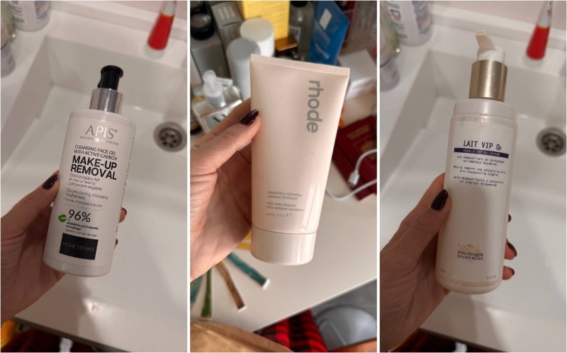 Самое важное – это хорошее очищение кожи после макияжа, поэтому у меня много очищающих средств. Часто использую по два разных. Обязательно беру Make-up removal от APIS – в его составе чёрный уголь, он как ластик стирает всё. И, к примеру, вторым средством беру Lait VIP O2 от Biologique Recherche – она немножко кремовая, хорошо питает и увлажняет кожу, вся сухость от воды максимально уходит. Этот бренд – моя большая любовь, у меня есть абсолютно вся их продукция.
