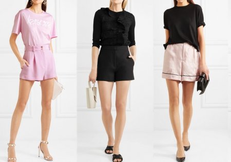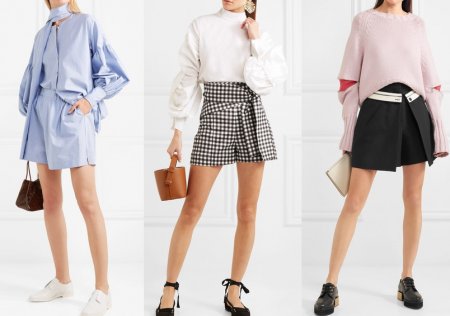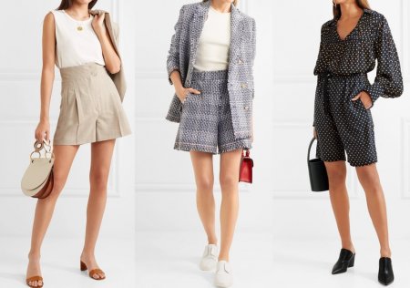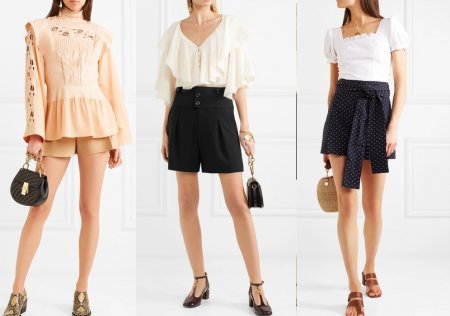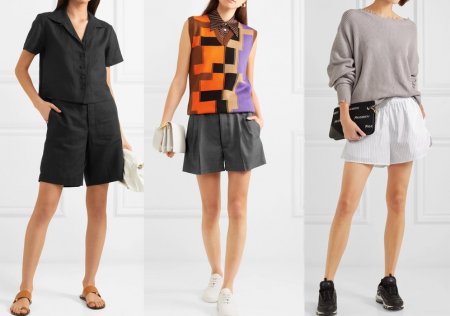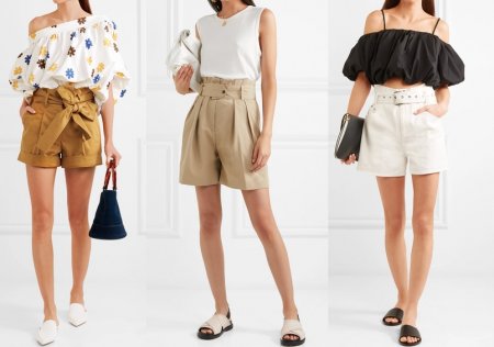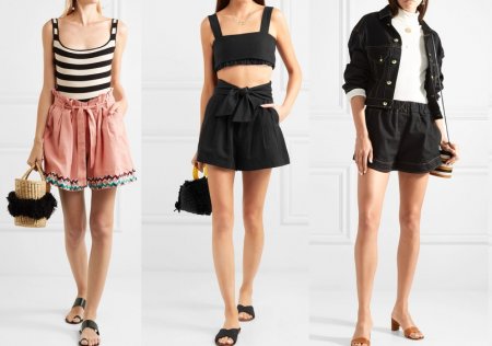 Я очень рада, что в этом сезоне (и не только в этом, но сейчас их особенно много) в тренде свободные шорты, которые слегка или сильно расклешены и имеют трапецевидный силуэт. Это реально спасение для тех, чьи бедра далеки от идеала. Лично мне даже в самые свои худые годы казалось, что короткие джинсовые шорты в обтяжку — не очень-то комплиментарны моей внешности. А вот свободные модели — самое оно. Оптимальное сочетание комфорта и красивого внешнего вида. Такие шорты отлично смотрятся и с футболками, и с короткими топами, и с куртками и жакетами. Они универсальны и идут почти всем Чем хороша эта модель шорт? Они внизу широкие, поэтому вы никогда не попадете в ситуацию, что ваши ноги будут перетянуты шортами в своей полной части. Более того, именно за счет этой ширины штанины — ноги будут казаться даже немного стройнее. Лето актуальны комплекты в стиле, который я описывала в статье «отпуск в рыбацкой деревне» — чаще всего это сине-белая полоска. Но «пляжные» и тропические принты тоже пользуются популярностью. В этом сезоне очень много моделей с завышенной талией. Как будто высокие и очень свободные шорты просто стянули поясом на талии. На всякий случай считаю нужным уточнить, что не стоит в такой модели надеяться только на пояс. Шорты должны сидеть на талии хорошо без него, а пояс — это уже скорее декоративная деталь. За счет свободного силуэта и длины (которая иногда доходит до колена) такие шорты уже не обязательно вписывать только в летне-пляжный контекст. Они отлично подходят для повседневного городского образа. Или даже для похода в офис, если это позволительно вашими корпоративными правилами. Не забываем, что в таком случае стоит сочетать шорты с довольно строгой обувью без каблука. Ни расслабленность босоножек из веревочек, ни легкомысленность шпилек не будут тут к месту. Даже если вы из-за жары сделаете выбор в сторону открытой обуви — выглядеть она должна лаконично и строго. Напоминаю, что это я про офисный вариант. Просто же для прогулки в жарком летнем городе — выбор гораздо шире. Подобные шорты могут даже стать частью романтического образа. Если вы делаете упор именно на романтику или fashion — тогда вполне будут уместны туфли на каблуке или другие броские аксессуары.