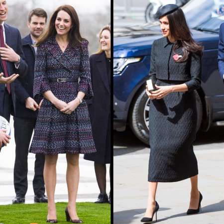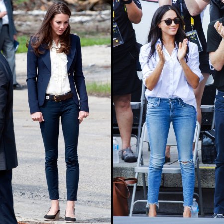 Женский костюм — своего рода модная униформа. Королевский статус обязывает Кейт придерживаться классического, строгого стиля — у нее десятки брючных и юбочных костюмов. При этом юбки принцесса предпочитает выше колена, а сам образ зачастую дополняет жакетами приталенного силуэта. Ее примеру следует и Меган.