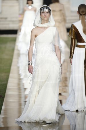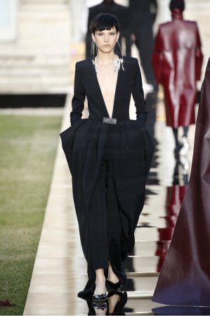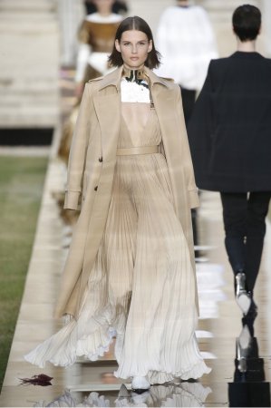 Никаких маленьких черных платьев — в коллекции из 42 образов Келлер сделала акцент на той части творчества дизайнера, которая была меньше связана с Голливудом и больше — с чистым искусством: объемные кейпы из перьев, вечерние платья с графичными вырезами, пальто, расшитые серебряными пластинами, наряды, напоминающие рыцарское облачение, в котором вместо кольчуги — тончайший плиссированный шелк и бархат. Дизайнер собрала на подиуме главные архивные хиты Живанши с поправкой на современные материалы и искусную работу мастериц ателье Givenchy, выход которых стал такой же полноценной частью шоу, как и традиционный поклон дизайнера. Под ностальгический саундтрек, разумеется, Moon River.