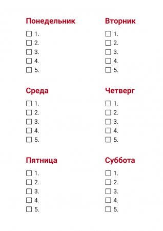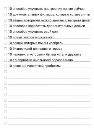 Есть в жизни события, рядом с которыми хочется условно поставить галочку. Ну например, «прочитал 100 книг» — ?, «прыгнул с парашютом» — ?, «покорил Эльбрус» — ?, «поздоровался за руку с Путиным» — ?. Мы стремимся к увеличению числа таких галочек, а сейчас как раз лучшее время, чтобы их поставить. Ведь начало года — это как большой понедельник, когда каждый обещает себе стать лучше и достигнуть великих целей. Но как же делать это правильно?У AdMe.ru есть для вас несколько чек-листов, которые помогут выполнить задуманное. Выберите любой или же забирайте сразу все. 10. Читать каждый день по одной главе Почему по главе, а не сразу всю книгу? Получение информации небольшими порциями называется микрообучением. За короткие сессии до 25 минут мозг лучше усваивает информацию, а в перерывах между ними успевает отдохнуть и «переварить» прочитанное. Начните с самой интересной книги, чтобы читалось вам с удовольствием. Носите ее повсюду с собой и держите возле кровати, чтобы читать перед сном. Можно поставить планку не в одну главу, а в 20 страниц, тогда через 30 дней вы прочтете 600 страниц, или 2–3 книги. 9. Попробовать флекситарианскую диету Есть овощи полезно. И мясо тоже есть полезно. Поэтому лучшим решением будет найти золотую середину. Флекситарианская диета — это баланс между растительной пищей и мясом. Можно есть все, но в определенные дни, чтобы получить все необходимые компоненты. Cоставьте себе меню на каждый день: это поможет не ломать голову каждый раз во время готовки, а также вам будет легче придерживаться плана. Ставьте цели и фиксируйте результат — вес, цвет кожи, количество прыщиков и т. д. 8. Учить по 5 новых слов каждый день Если учить по 5 иностранных слов каждый день, то за месяц вы узнаете 150 слов, а за год 1 825 слов — этого хватит, чтобы общаться на неродном языке весь день почти на любые темы. А еще через полгода вы сможете читать газеты, книги и классическую литературу. Звучит круто, но, чтобы учить слова, нужно следовать системе, поэтому мы сделали для вас чек-лист, который будет служить мотивацией и напоминанием. 7. Не жаловаться, не сплетничать и не осуждать Нытик перестает замечать хорошее, зарывает свои таланты и портит настроение себе и людям. Этого достаточно для того, чтобы дать себе обещание в последующие 30 дней не ругаться, не ворчать, не критиковать и не жаловаться. И тогда вы увидите, как изменится ваша жизнь. Расскажите членам семьи и друзьям о вашем челлендже и попросите их напомнить вам, если вы потеряете контроль. А в конце дня записывайте, сколько раз вы закатывали глаза, повышали голос или злобно бубнели. Распечатайте лист и отмечайте в конце дня ваши успехи в воздержании от нытья в виде смайлика. А внизу списка фиксируйте результат за всю неделю. 6. Просыпаться на 30 минут раньше Чтобы все успевать, вставать лучше рано. Пожалуй, это проще сказать, чем сделать. Вечером мы даем себе слово начать новую жизнь и просыпаться до восхода солнца, а утром решительно на это дело забиваем. Не стоит себя мучить и заводить будильник на 6 утра, если вы привыкли спать до 8 часов. Для начала попробуйте вставать на 15–30 минут раньше. И вскоре вы заметите, что успеваете спокойно выпить чашку кофе, почитать книгу и собрать детей в школу. 5. Каждый день записывать 10 идей Если каждый день записывать по 10 идей на самые разные темы, то в конце месяца у вас будет уж