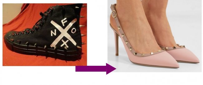 Кстати, про сглаживание агрессии в субкультурных вещах и выведение их в плоскость массовой культуры и моды, мы можем поговорить еще и на более конкретном и ярком примере — это обувь Valentino Garavani The Rockstud, где острые шипы, присущие панковской культуре, вдруг сгладились до невысоких золотистых пирамидок и их разместили даже на самых консервативных моделях туфель.